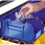 polypropylene bins stack together or hang from Akro-Mils louvered racks