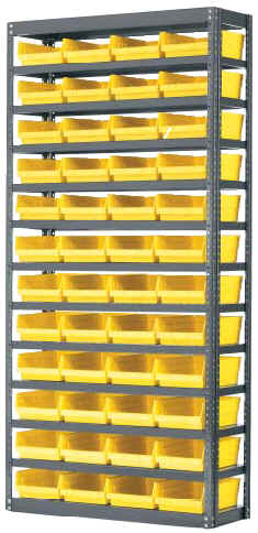 Manufactured from high-grade, 22-gauge steel with a baked enamel finish. Shelving can be ordered independently or purchased with bins as a complete system. The shelving units are easy to assemble, using nuts and bolts only on the top and bottom shelves. All other shelves are quickly assembled and can be adjusted when necessary using compression clips. All units feature a "sanitary", closed base that keeps debris and small parts from underneath the shelving.