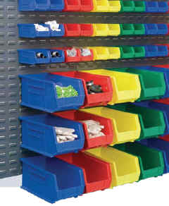 polypropylene bins stack together or hang from Akro-Mils louvered racks
