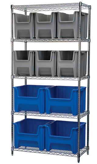 warehouse space. Heavy-duty, polypropylene bins stack